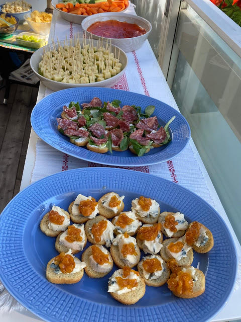 När vi hade mumsat klart av allt gott fikabröd dukade vi fram bubbel och snittar. Gott med nå salt i värmen och ingen fest utan goda bubblor, igår bjöds vi på både Prosecco och Cava.